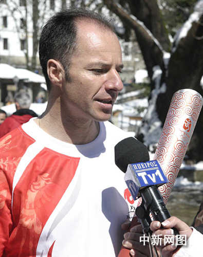 3月26日,北京奧運(yùn)會(huì)圣火希臘境內(nèi)傳遞第三日,抵達(dá)冰雪覆蓋的山城邁措翁。火炬手、希臘越野滑雪運(yùn)動(dòng)員尼克考斯期待自己能參加2010年溫哥華冬奧會(huì)。中新社記者 王歡