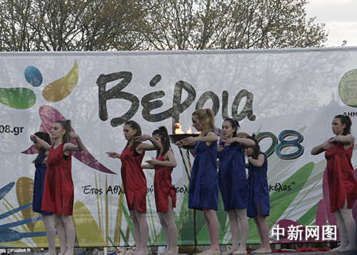 3月26日,北京奧運會圣火希臘境內傳遞第三日,抵達當天最后一個城市韋里亞。慶典儀式上,演員身穿代表奧運五環顏色的衣服翩翩起舞。中新社記者 王歡