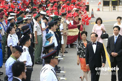 十月一日,香港金紫荊廣場(chǎng)舉行慶祝中華人民共和國(guó)成立五十九周年升旗儀式。儀式在八時(shí)正開(kāi)始。香港特區(qū)行政長(zhǎng)官曾蔭權(quán)及多名官員出席。中新社發(fā) 張勤 攝