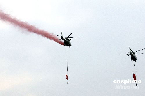 升旗儀式中,直升機(jī)懸掛國旗、區(qū)旗,噴射彩色煙火掠過金紫荊廣場上空。