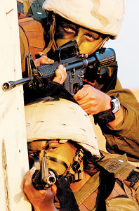 M-4A1卡賓槍——以色列士兵貼身武器,有效射程不超過300米。對比AK-47來說,M-4A1卡賓槍在精度上有優勢,但在射程及殺傷性上稍微遜色。(木生 李亮亮 沈基飛)