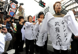 同時,日本在野黨民主黨派出了三位高官夫人——民主黨最高顧問、日本前首相羽田孜的夫人綏子、代表代行菅直人的夫人伸子、干事長鳩山由紀夫的夫人幸!叭蛉塑妶F”身穿廚師樣式的服裝,上書“改變!政權替換”,來到東京巢鴨的購物街,和正在購物的家庭婦女一一握手。其間,一名60歲的老婆婆一臉郁悶,說“我已經在很努力削減家庭開支了,可是國家還是在浪費。”三位夫人馬上建議說,“下次讓民主黨執政看看吧!”