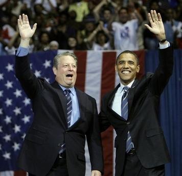 戈爾和奧巴馬當天在集會上向支持者們問候。