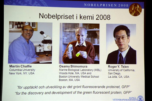 中新網10月8日電 綜合報道,瑞典皇家科學院諾貝爾獎委員會于當地時間10月8日11時45分左右(北京時間10月8日17時45分左右)宣布,將2008年度諾貝爾化學獎授予美國日裔科學家下村修(Osamu Shimomura)、美國科學家馬丁·查爾菲(Martin Chalfie),以及美國華裔科學家錢永健。他們三人在發現和研究綠色熒光蛋白(GFP)方面有突出成就。