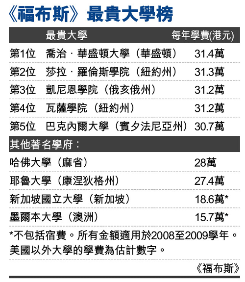 中新網2月10日電 全球經濟衰退,大學要獲得資金也變得困難,學費自然要加價。《福布斯》雜志列出學費最貴的大學名單,美國排名首5位,這些大學于2007至2008年學費加價4.8%。另外,新加坡國立大學(NUS)躋身美國以外的最貴大學排名榜中。