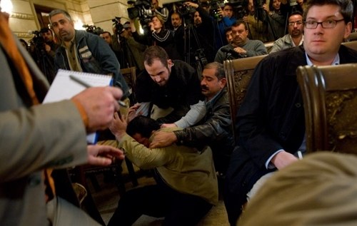 不過,塔拉巴尼的話似乎并不能代表全體伊拉克人民的真實感受。在與馬利基的聯(lián)合發(fā)布會上,布什講話時,一名伊拉克記者將兩只鞋朝布什扔了過去,并高聲辱罵:“這是伊拉克人民給你的告別之吻!”好在布什身手敏捷,彎腰躲過了襲擊。隨后,馬利基英雄救“美”,用身體擋住了這位美國客人,而那個丟鞋的男子也被保安制服。