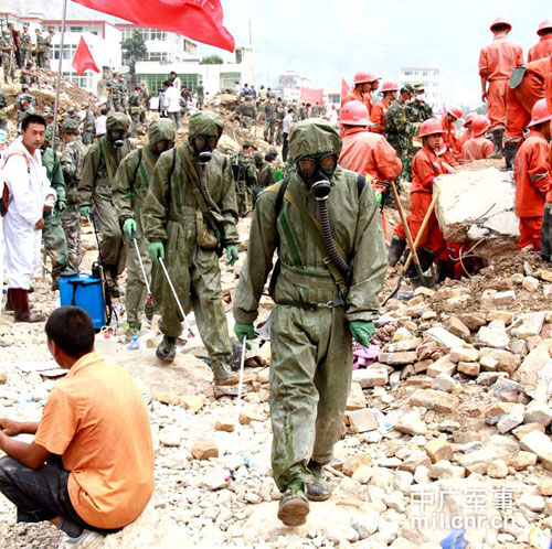 記者在現場看到,蘭州軍區某集團軍防化團官兵對每名挖出來的遇難群眾遺體進行認真細致的消毒、殺菌。核生化應急救援分隊的官兵身著密不透風的連體橡膠防護服,攜帶手持消毒機對救災現場實施噴灑作業,每走幾步,都會大汗淋漓。防化團團長蒲軍禮告訴記者,現在防疫形勢仍然很嚴峻,因為遇難者遺體挖掘出來后,氣味很大,消毒必須嚴密組織。為了保障救災工作順利進行,部隊規定,只要在災區作業,帶手套、帶口罩、穿長袖要作為一項紀律嚴格執行。
