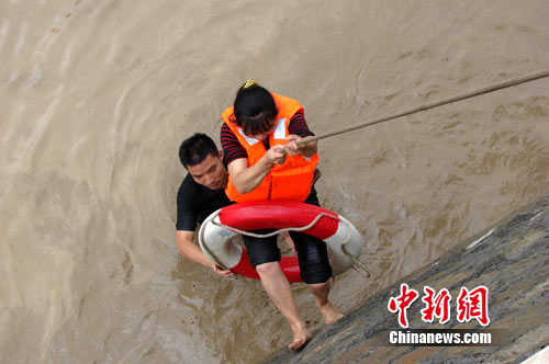 消防官兵搜尋到中攤堡大道,聽到中普建設楓香樹村安置房與中攤堡安置房交界處傳來求救聲音,利用強光手電筒發現:洪水已將4名來不及疏散的施工人員團團包圍,工人在樓頂揮手、呼喊求救。“不要著急,我們馬上想辦法過來救你們”。由于水流很急且到處都是施工隊挖的暗溝,時間緊迫,消防站余柯政站長來不及多考慮,立即下令,將保險繩拴在消防車上,余站長和劉飛穿上救生衣,綁好安全繩后,帶著救生圈慢慢的游到被困群眾位置,將救生衣為民工穿好后,一邊由消防官兵護送一邊由在消防車一邊的其余消防官兵牽引安全繩接應,緊急轉移被困群眾。一趟、兩趟、三趟……經過近半小時的奮戰,成功救出被困工人。