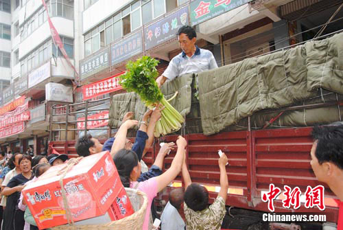 中新網舟曲8月20日電 (記者 侯志紅) “從14日下午開始我們我們已經有蔬菜上市了,但目前因道路受到限制,疏菜運輸還比較困難,因此, 疏菜成了舟曲居民的搶手貨!敝矍h政府附近一位菜灘的女老告訴記者。