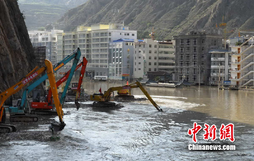 中新網南昌8月26日電(何柳斌 徐迎華 聶中成)8月26日,武警水電部隊官兵在甘肅舟曲白龍江城江大橋上游進行清淤翻渣施工作業。當日,武警水電部隊所承擔的作業區域已經延伸至城江大橋上游300米處。