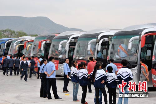 29日上午28輛大型客車,將舟曲一中第二批異地就學的1080名高二級學子安全送到定西安置點--定西理工中專。侯志紅攝