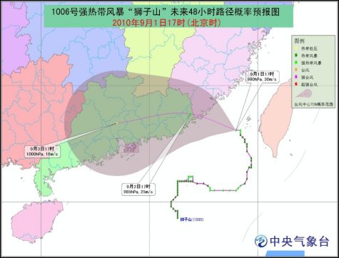 中新網9月1日電 據中央氣象臺預計,強熱帶風暴“獅子山”將以每小時10~15公里的速度向西北轉偏西方向移動,強度還將略有加強,并逐漸向廣東汕尾到福建廈門一帶沿?拷,將于明日凌晨到上午在這一帶沿海登陸。