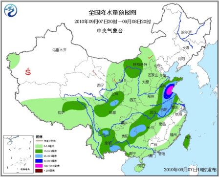7日20時至8日20時,新疆西南部、青海南部和東部、西藏中東部、西北地區中東部、內蒙古中部偏西地區、華北大部、黃淮、江淮、江漢、江南中西部和北部、華南大部、西南等地有小到中雨或陣雨,其中山東中南部、安徽大部、江蘇北部和西部、湖北東部、湖南中部偏西地區、貴州東部、甘肅東南部、川西高原北部、云南東南部等地有大雨或暴雨;山東東南部和江蘇北部的局部地區有大暴雨;上述部分地區并伴有短時雷雨大風等強對流天氣。內蒙古中西部有4~6級風;南疆盆地的部分地區有揚沙或浮塵天氣。臺灣海峽有5~7級東北風;臺灣以東洋面有6~8級大風;臺灣以南海域有5~7級旋轉風;南海東北部海域將有5~7級偏西風。另外,渤海、渤海海峽將有5~7級、陣風8級的東北風。