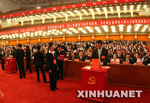 中新社北京十月二十一日電 中國共產黨第十七次全國代表大會今天上午在人民大會堂閉幕,代表們正在進行中央委員會的投票選舉。