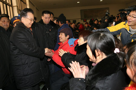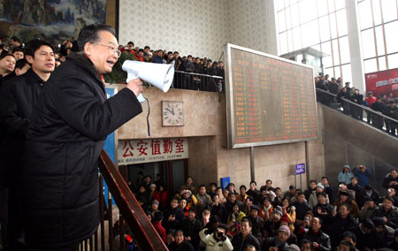 溫家寶總理對旅客說,春節快到了,我給大家拜個早年。你們被困在火車站,還沒能提早回家,我表示深深的歉意,現在我們正在想盡一切辦法搶修,一定把大家送回家過春節。