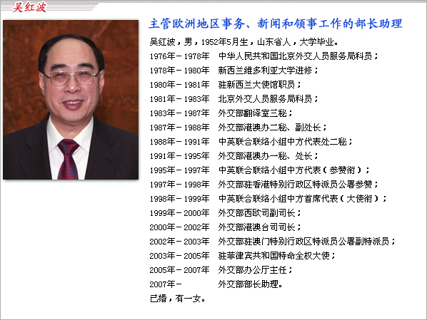 中國外交部資料顯示,吳紅波從二00五年起至二00七年擔任外交部辦公廳主任一職,二00七年至今擔任外交部部長助理。劉結一在二00六年至二00七年一年時間里,擔任了外交部美大司司長,二00七年至今一直為外交部部長助理。