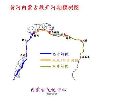 根據未來5天黃河內蒙古段沿線天氣預報,3月20日—21日氣溫略有回升, 3月22日 —23日,將有一次大風、沙塵及降溫天氣過程,氣溫下降6~8℃。受氣溫變化的影響,未來5天巴彥淖爾市臨河至烏拉特前旗段將逐步開河。
