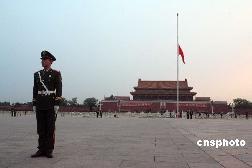中新網北京5月19日電 五月十九日凌晨四時五十七分四十秒,北京天安門廣場下半旗,沉痛哀悼在汶川特大地震中的遇難者。