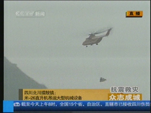 中新網綿陽5月26日電(霍潺)今天上午十一點零五分左右,一架紅色米-26直升機吊裝了一臺重約十三點二噸的重型挖掘機已起飛,前往唐家山堰塞湖壩體,大約二十多分鐘可以往返。