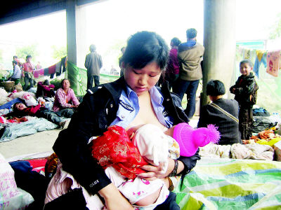 資料圖:蔣曉娟一手一個為災區嬰兒哺乳。