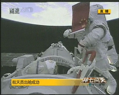 中新網(wǎng)9月27日電 中國(guó)“神七”載人飛船航天員翟志剛今天下午16時(shí)43分左右順利出艙,實(shí)施中國(guó)首次空間出艙活動(dòng)。他在出艙活動(dòng)中展示由劉伯明遞過(guò)來(lái)的中華人民共和國(guó)國(guó)旗。