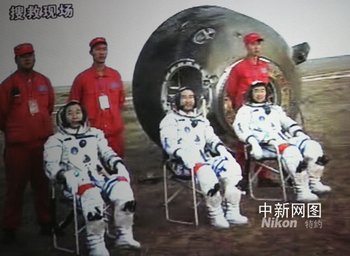 23時36分許:翟志剛著中國自主研發的“飛天”艙外航天服在太空首次亮相。