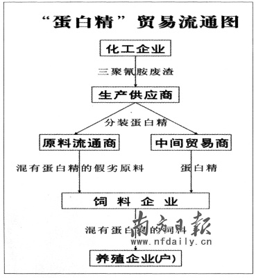 正是從那時開始,三聚氰胺開始流入飼料行業。廣東粵海飼料集團董事長鄭石軒認為,三聚氰胺廢料變身后的“蛋白精”在飼料行業中至少已經存在了五年,且愈演愈烈。