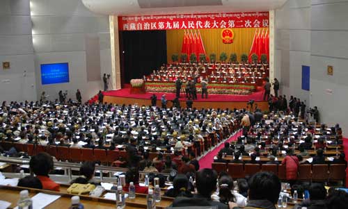 1月14日早上9點40分,西藏自治區九屆人大二次會議在拉薩隆重開幕。西藏自治區黨委副書記、自治區人大常委會主任列確主持會議。自治區黨委副書記、自治區主席向巴平措做《政府工作報告》。(韓連啟)