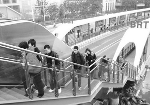 整座人行天橋以直跑樓梯連接通江南路兩側人行道,天橋中部則與BRT站臺以斜式扶手滾動電梯和直跑鋼梯相連接。而人行天橋兩部專供殘疾人使用的玻璃體房垂直升降電梯已經全部安裝到位,只不過電梯出口處的包裝紙還緊緊地粘在上面。