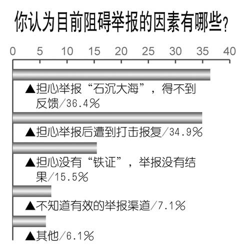 調查中,公眾給出的阻礙舉報的因素排序依次為:擔心舉報“石沉大海”,得不到反饋(36.4%);擔心舉報后遭到打擊報復(34.9%);擔心沒有“鐵證”,舉報沒有結果(15.5%);不知道有效的舉報渠道(7.1%)。