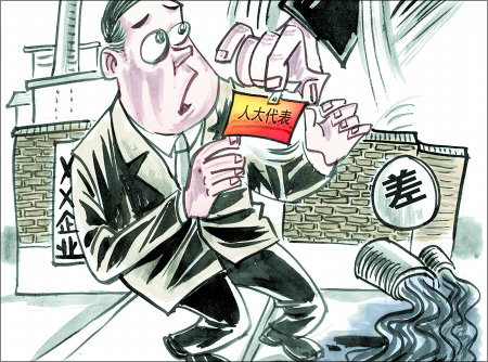 輝縣市有一家造紙廠的負(fù)責(zé)人是新鄉(xiāng)市人大代表,該造紙廠治污設(shè)備長(zhǎng)期閑置,經(jīng)常偷排污水,環(huán)保部門去檢查時(shí),負(fù)責(zé)人總是敷衍,由于其特殊的身份,在當(dāng)?shù)卦斐闪瞬涣嫉挠绊。這次對(duì)人大代表調(diào)研評(píng)價(jià)時(shí),環(huán)保部門給其一個(gè)“差”的評(píng)語(yǔ),這位人大代表再次提名時(shí)沒能通過。