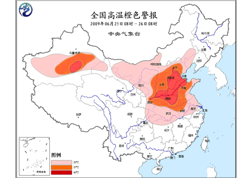 中新網6月25日電 據中國氣象局網站消息,中央氣象臺今天早晨六點鐘繼續發布高溫橙色警報:預計,今天白天,華北大部、黃淮、江淮、江漢、江南北部及陜西大部、寧夏中北部、甘肅北部、內蒙古中西部和新疆南疆盆地有35℃以上的高溫,其中,河北大部、京津、山西大部、山東大部、陜西東部、河南、安徽中北部、江蘇西北部及南疆盆地東部等地最高氣溫可達37~39℃,河北中南部、京津南部、河南中北部、山西南部、山東西部及南疆盆地東部等地局部氣溫可達40℃。