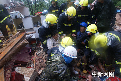 該房屋的二樓坍塌最為嚴(yán)重,房頂?shù)耐咂舅,瓦片、磚塊,泥石、水泥板堆滿了整個屋子,還有部分未完全倒塌的磚塊、梁柱仍在搖搖欲墜,現(xiàn)場一片混亂雜章。當(dāng)時,正下著大暴雨,極有可能發(fā)生二次坍塌。為了控制險情,消防官兵架起梯子,爬上屋頂,迅速拆除另一半未坍塌的屋頂瓦片。