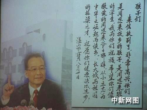 時隔兩個多月,讓孩子們激動萬分的是居然盼到了溫總理的親筆回信。溫總理在回信中說:“你們是周恩來故鄉的孩子,是‘周恩來班’的學生,我為你們祝福。希望你們像敬愛的周恩來爺爺那樣從小立志‘為中華之崛起而讀書’,長大成為祖國的棟梁之才。”