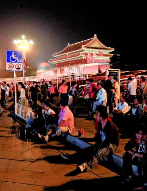 昨晚7時,天安門廣場周邊國慶照明設施首次全面試燈,眾多游客前來觀看。