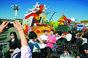 今天上午8時30分,60臺國慶彩車在天安門廣場亮相,開始進行為期6天的集中展示,開放時間比原計劃提前了一個半小時。在兩小時時間內(nèi),數(shù)萬市民和游客涌入廣場參觀,爭相與彩車合影,國慶彩車當之無愧地成為今天的廣場明星。