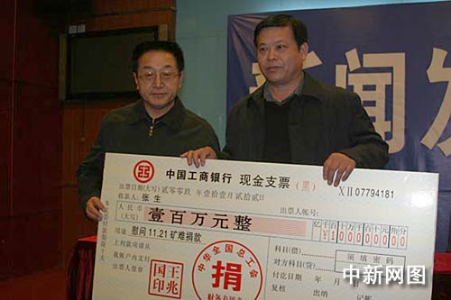 中新網鶴崗11月22日電 (記者 吳兆飛)中華全國總工會22日向鶴崗礦難遇難礦工家屬捐贈100萬元,中華全國總工會副主席、書記處書記張鳴起在捐贈儀式上還呼吁重視生產安全。此外,黑龍江和鶴崗的工會部門也同時分別捐贈了50萬元和10萬元。