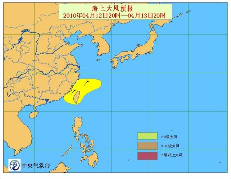 2010年4月12日20時至13日20時海上大風預報區域圖
