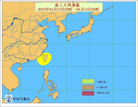 2010年4月13日20時至14日20時海上大風預報區域圖