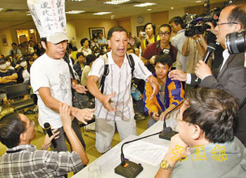 在民建聯舉辦的集會上,雷曼迷你債券苦主表現激動,黃先生(中)指其母親得知他虧了數百萬元,當場受刺激死了。(圖片來源:文匯報)