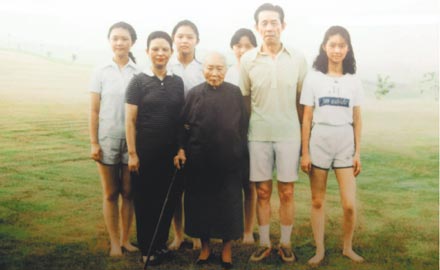 一九八一年王永慶(右二),與母親王詹樣(右三)在長庚球場合照,身邊還有夫人李寶珠(左二)和四個千金。聯合報系資料照片