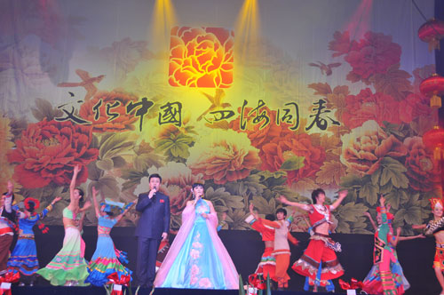 演出前,藝術(shù)團(tuán)團(tuán)長、國務(wù)院僑辦副主任趙陽發(fā)表了熱情洋溢的講話。他代表國務(wù)院僑辦和李海峰主任向旅居澳大利亞的廣大僑胞和現(xiàn)場觀眾致以新春的祝福。趙陽指出,剛剛過去的2009年,是新中國成立60周年,60年來中國所取得的巨大成就離不開海外僑胞的關(guān)心和支持。“文化中國 四海同春”藝術(shù)團(tuán)為大家?guī)砹俗鎳H人的親切問候和美好祝愿。