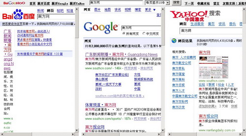 看到這個(gè)頁(yè)面,你一定會(huì)覺得很“雷”吧!還有更“雷”的在后面,為驗(yàn)證搜索效果,記者嘗試輸入“南方網(wǎng)”進(jìn)去搜索,發(fā)現(xiàn)搜索出來的結(jié)果、頁(yè)面也是和百度、谷歌、雅虎一樣,只不過是把三大網(wǎng)站搜索結(jié)果進(jìn)行了并列排放。