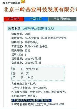 2月4日上午10時許,《史上最牛招聘啟事,可是正規(guī)發(fā)布的哦!》這個帖子在天涯社區(qū)迅速引起關(guān)注。發(fā)帖者網(wǎng)友“木鼠”稱在成都招聘網(wǎng)上發(fā)現(xiàn)一條招聘經(jīng)理助理的啟事,其中竟有“能夠接受成為經(jīng)理暫時性伴侶”這樣的字眼。