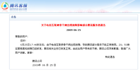昨晚20時20分許,記者在騰訊官方網上看到一則《關于運營商設備故障影響部分騰訊服務的通告》已經發布,回應稱:6月25日17時46分左右,由于電信運營商出現設備故障,導致騰訊部分服務不能正常使用。騰訊正在積極配合運營商進行故障排除。