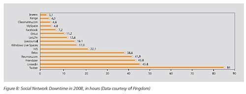 Twitter去年宕機(jī)時(shí)間至少是其競爭對(duì)手的2倍,其2008年的總宕機(jī)時(shí)間為84小時(shí),排名首位。