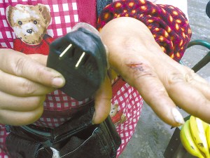 “這就是電池爆炸后留下的傷口。今天是第三天了,傷口還是痛。”昨天下午,記者見到了最近為手機(jī)電池傷透了腦筋的鄧女士,她揚(yáng)起左手食指給記者看時(shí),還有些心有余悸。因?yàn)榇饲暗谋ǎ笫质持傅谌齻(gè)關(guān)節(jié)處已皮開肉綻,一條近2厘米的傷口很顯眼。