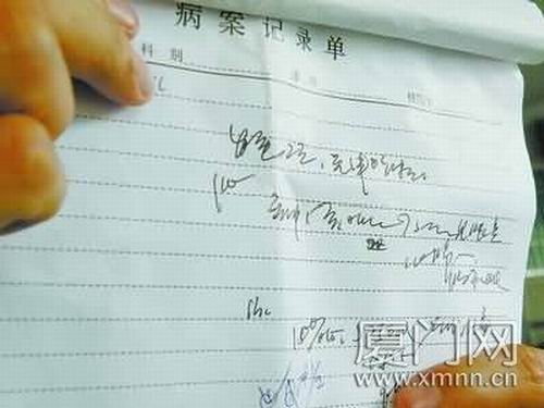 1日下午,在市內某大醫院的兒科候診區,記者隨手向一名帶孩子前來復診的家長借了份病歷,一看就懵了:除了“09.2.1”的日期和表示藥物劑量的幾個阿拉伯數字能看清,其他字跡根本無法辨認!搬t生寫字都是這樣!边@位家長說,他從來就不去看病歷,看了也看不懂。