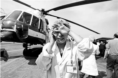 昨天下午4點(diǎn)05分,東方通用航空公司的一架米1-71直升機(jī)緩緩降落在廣漢機(jī)場停機(jī)坪上。艙門打開,40歲的女護(hù)士杜娟下了飛機(jī),招呼著成都120急救中心的醫(yī)護(hù)人員將傷員抬到急救車上。杜娟是北川縣禹里羌族鄉(xiāng)衛(wèi)生院的護(hù)士。5·12地震后,禹里與世隔絕,直到昨天才等到直升機(jī)將重傷者送出。杜娟隨機(jī)照顧患者。傷員都下了飛機(jī)后,杜娟向于波借手機(jī),電話打通時,她手開始顫抖,撕心裂肺的哭聲終于無法忍住。那是她六天后,第一次給外面的親人打電話。巨大的螺旋槳轉(zhuǎn)動聲中,人們只能依稀聽到她的哭訴:“我要去找他,不能連個尸體都沒有。”于波默默地看著她,不到一個小時前,他還覺得這個女護(hù)士嚴(yán)厲得有點(diǎn)過分。