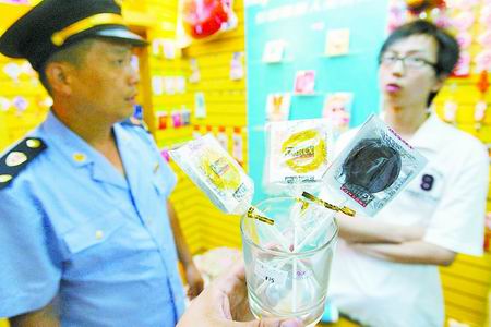 但面對詢問,該店店長稱老板在外地,相關手續可能還未辦理。最后,執法人員將該店的安全套用品全部暫扣。(記者李 巖 實習生 齊葉帆文 記者許俊文 圖)